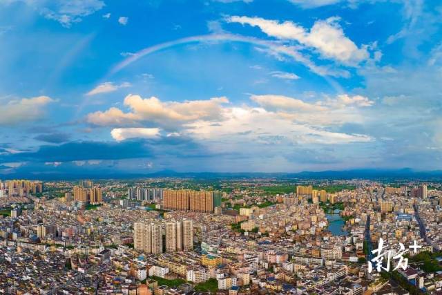 傍晚雨后,广东云浮罗定上空出现一道美丽的彩虹。南方+拍客 黄冬泳 摄