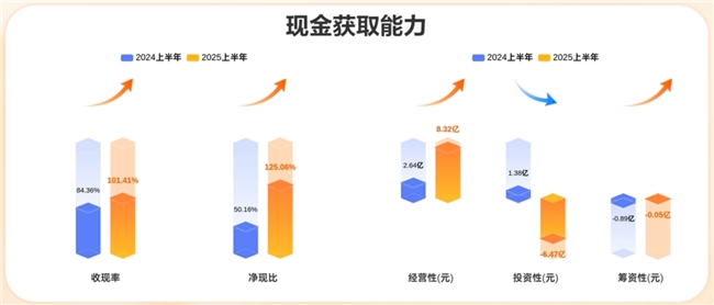 现金获取能力方面,收现率从84.36%上涨到101.41%,净现率从50.16%上涨到125.06%,经营性,筹资性现金流同比增长,投资性现金流同比下降。