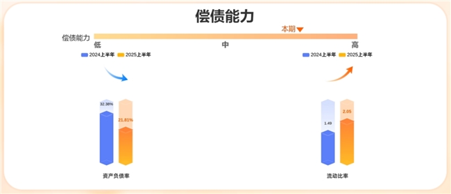 偿债能力方面,本期公司的偿债能力较高,其中资产负债率从32.38%,下跌到21.81%,流动比率从1.49上涨到2.05。